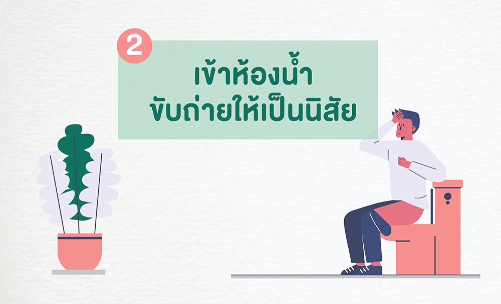2.เข้าห้องน้ำ ขับถ่ายให้เป็นนิสัย ตอนเช้าช่วงเวลาที่ดีที่สุดคือ ตี 5 – 7 โมงเช้า เพราะเป็นช่วงเวลาที่ลำไส้ใหญ่ทำงานขับกากอาหารและของเสียทั้งหลายออกจากร่างกาย
