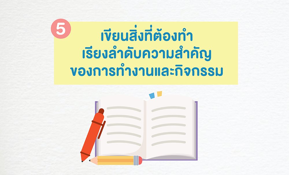 5.เขียนสิ่งที่ต้องทำใน 1 วัน เรียงลำดับความสำคัญของการทำงานหรือกิจกรรมที่เราต้องทำ จะช่วยให้เราสามารถทำสิ่งนั้นได้ทันเวลาและมีประสิทธิภาพที่ดีด้วย