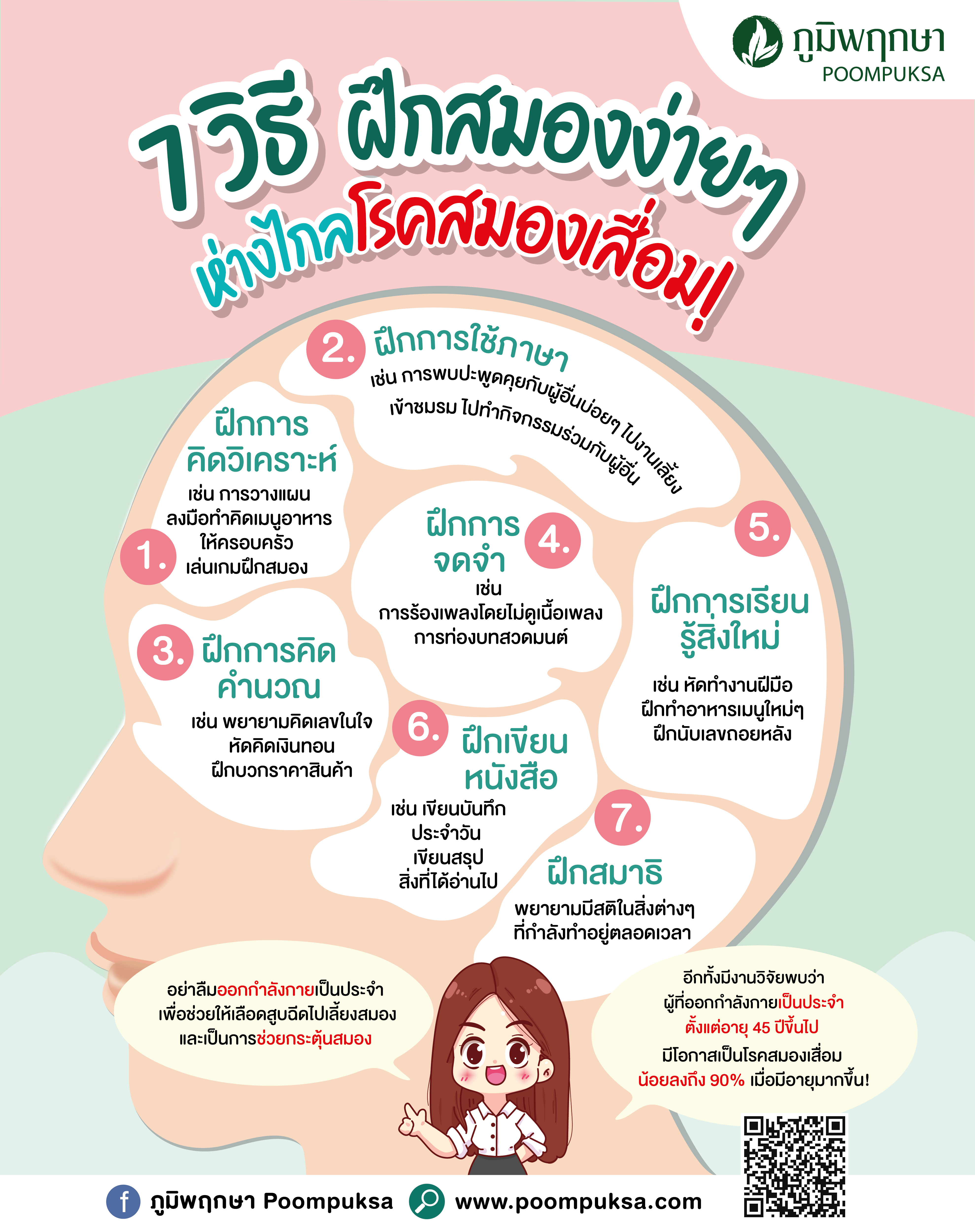 Tips: อย่าลืมออกกำลังกายเป็นประจำ เพื่อช่วยให้เลือดสูบฉีดไปเลี้ยงสมองและเป็นการช่วยกระตุ้นสมอง อีกทั้งมีงานวิจัยพบว่าผู้ที่ออกกำลังกายเป็นประจำตั้งแต่อายุ 45 ปีขึ้นไป มีโอกาสเป็นโรคสมองเสื่อม น้อยลงถึง 90% เมื่อมีอายุมากขึ้น