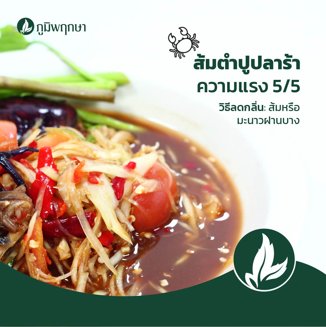 พูดถึงอาหารกลิ่นแรงแล้วจะขาดเมนูที่มีชื่อเสียงในเรื่องกลิ่นได้ยังไง แต่ต่อให้กลิ่นแรงแค่ไหน ถ้ามันอร่อยก็ไม่มีปัญหา วิธีการดับกลิ่นจากเมนูส้มตำปูปลาร้า ก็ง่ายแสนง่าย เพียงแค่กินส้มหรือมะนาวฝานบาง กลิ่นปลาร้าที่ผ่านการหมักมานั้นก็จางลงได้ง่าย ๆ เพราะจะมีน้ำมันหอมระเหย ที่ช่วยลดกลิ่นของกะปิและปลาร้าได้ และหากมีกลิ่นติดมือหรือผิวหนัง สามารถใช้เปลือกส้มหรือมะนาวมาถูบริเวณที่มีกลิ่น และล้างด้วยน้ำสะอาดตามได้ด้วยเหมือนกันนะ!