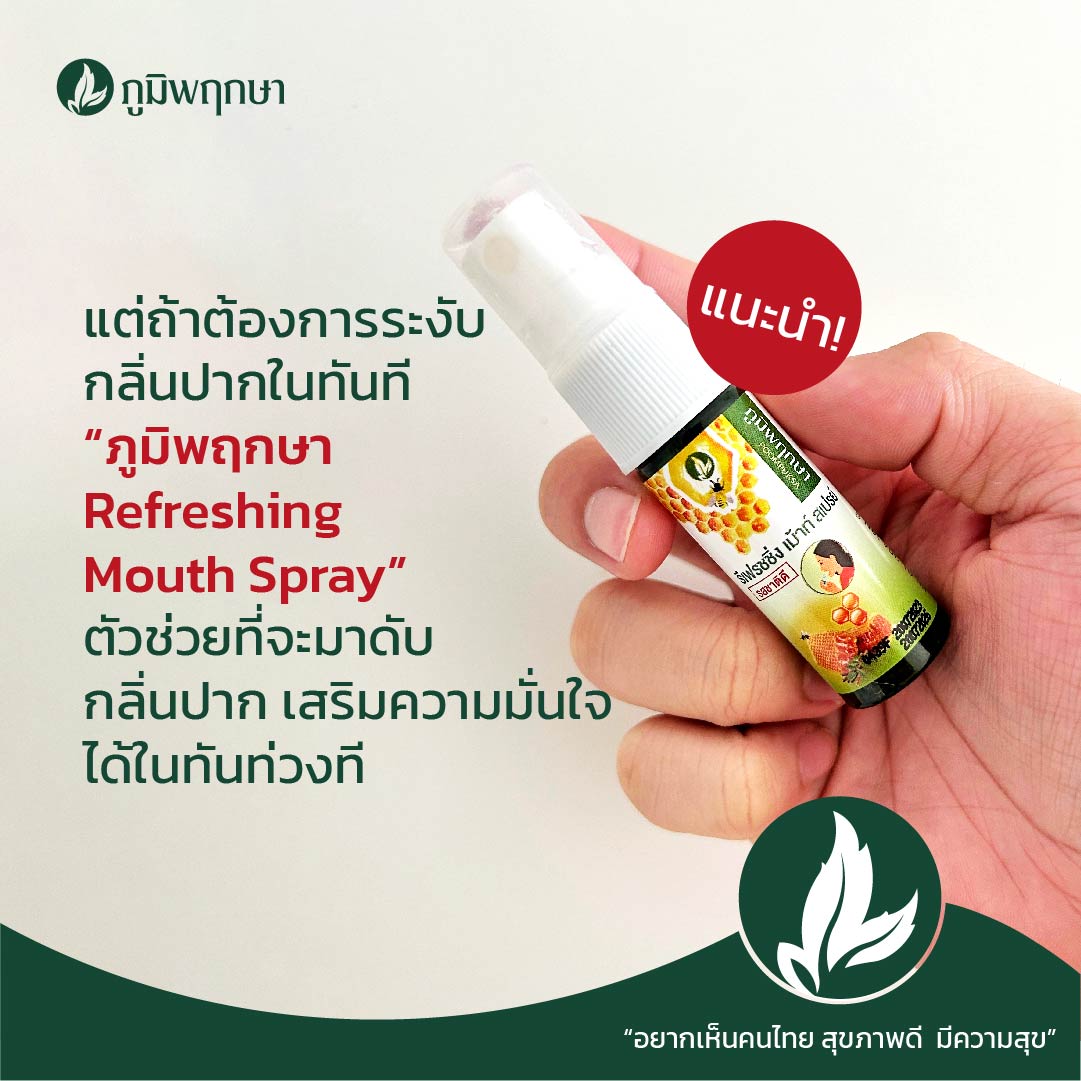 TIPS ถึงจะกลิ่นแรงแค่ไหนแต่เมื่อร่างกายดูดซับสารอาหารและขับถ่ายออกมา กลิ่นที่ไม่พึงประสงค์จากอาหารก็จะหายไปเอง แต่ถ้าต้องการระงับกลิ่นปากในทันทีใช้ รีเฟรชชิ่ง เม้าท์ สเปรย์ ภูมิพฤกษา ตัวช่วยที่จะมาดับกลิ่นปากเสริมความมั่นใจได้ในทันท่วงที ฉีดได้บ่อยตามที่ต้องการ