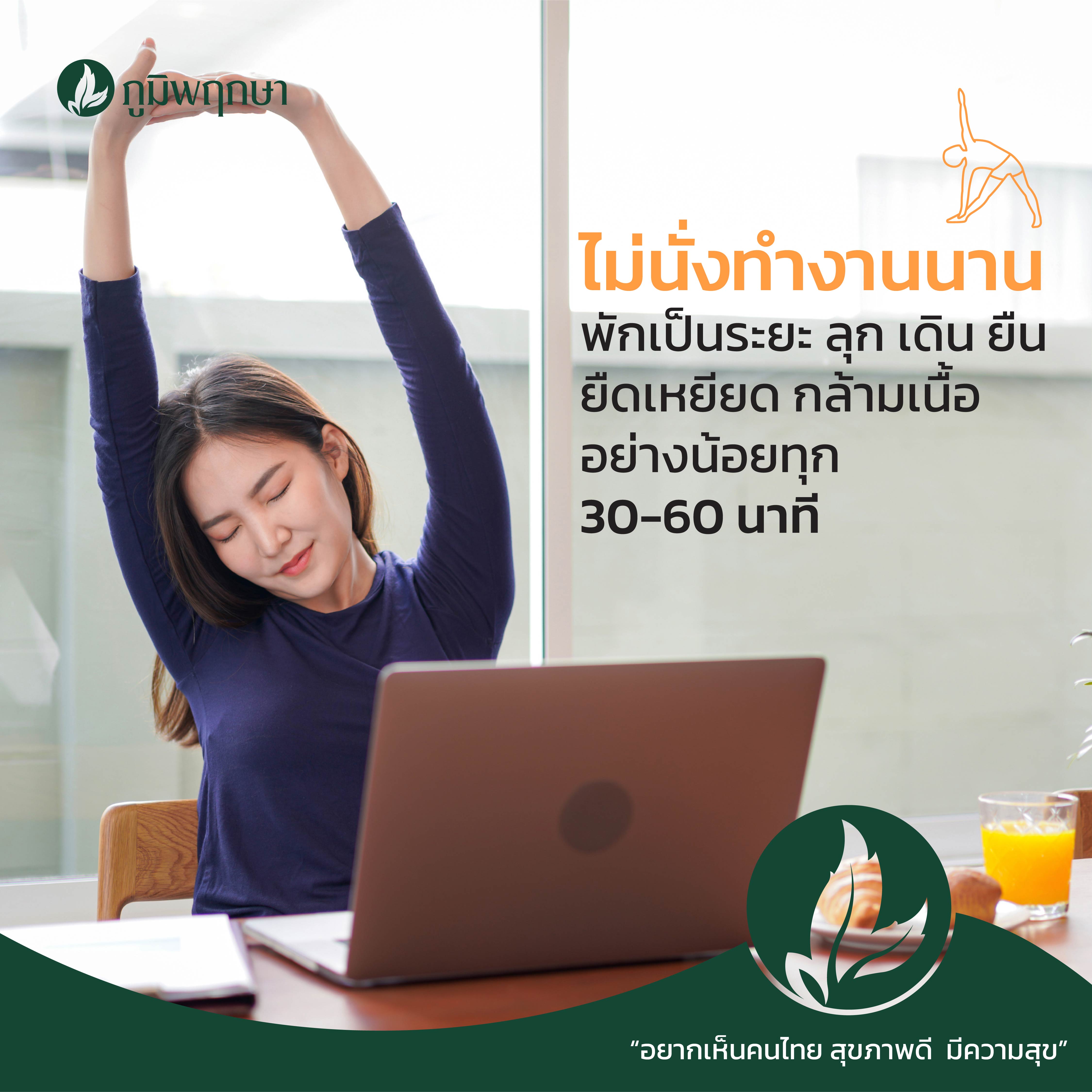 2. ไม่นั่งทำงานนาน พักเป็นระยะ - ลุก เดิน ยืน ยืดเหยียดกล้ามเนื้อ อย่างน้อยทุก 30-60 นาที