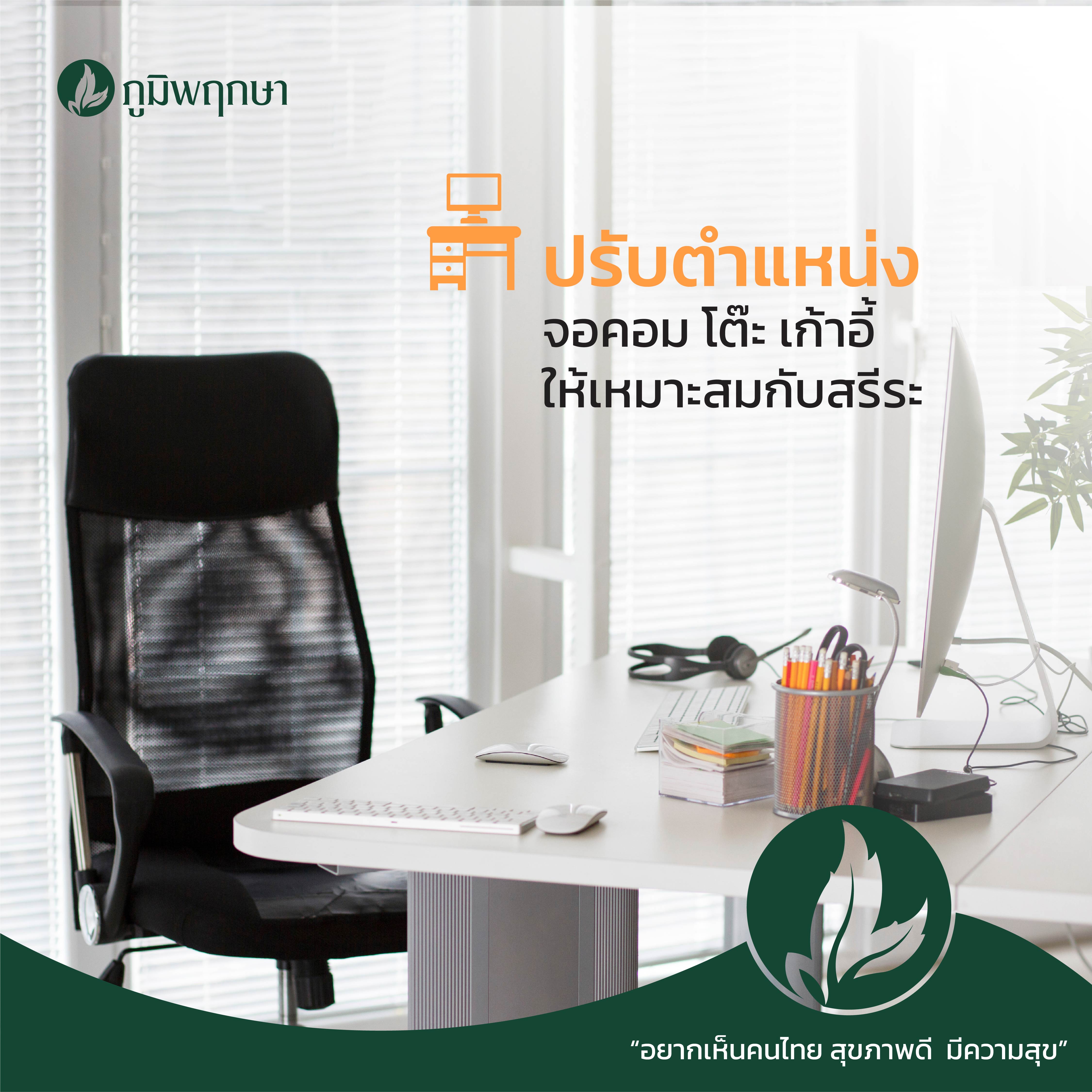 3. ปรับตำแหน่ง จอคอม โต๊ะ เก้าอี้ ให้เหมาะสมกับสรีระ - กึ่งกลางจอคอมอยู่ในระดับสายตา แป้นคีย์บอร์ดอยู่ในระดับข้อศอก