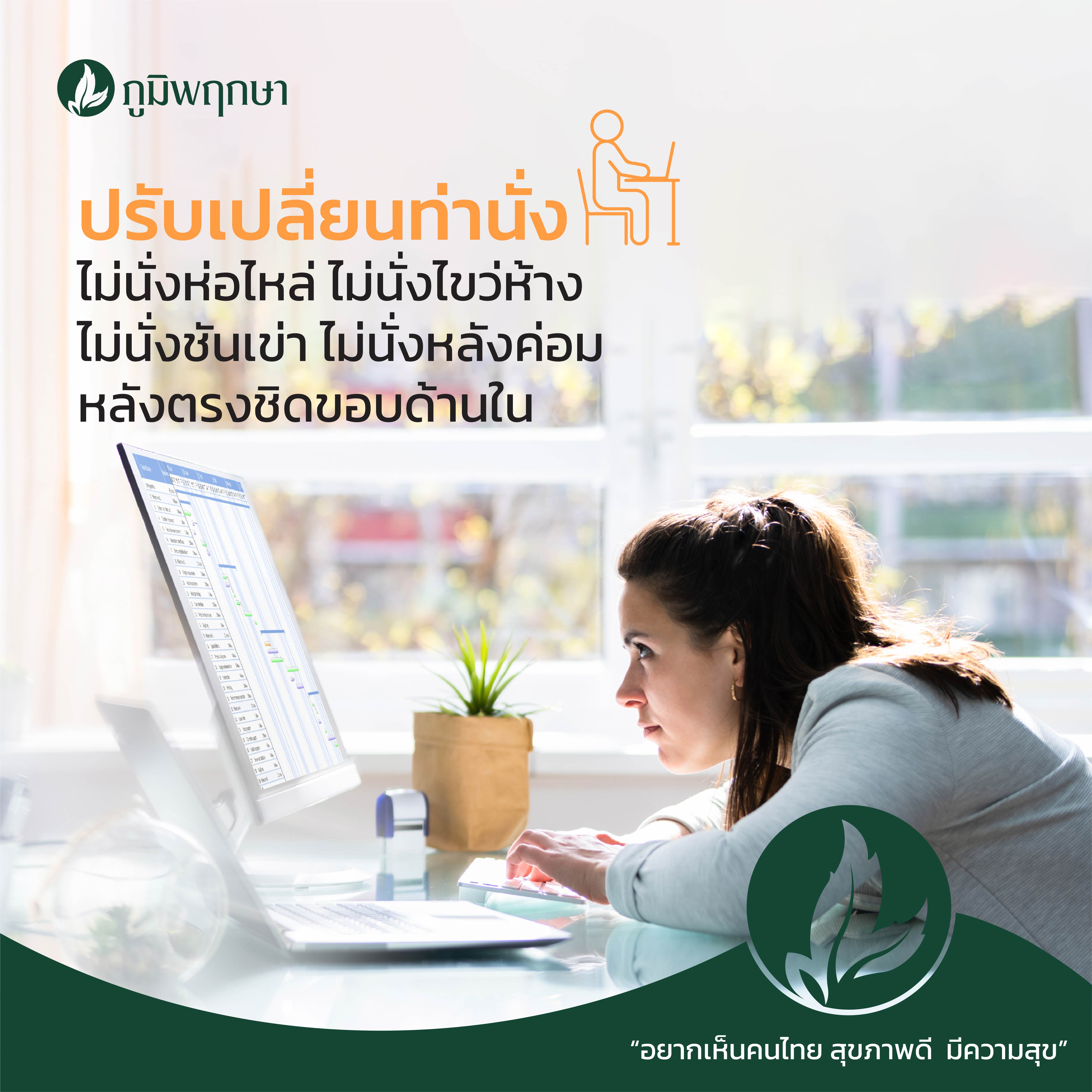 4. ปรับเปลี่ยนท่านั่ง - ไม่นั่งห่อไหล่ ไม่นั่งไขว่ห้าง ไม่นั่งชันเข่า ไม่นั่งหลังค่อม นั่งเก้าอี้ให้เต็มก้น หลังตรงชิดขอบด้านใน มีหมอนหนุนหลัง