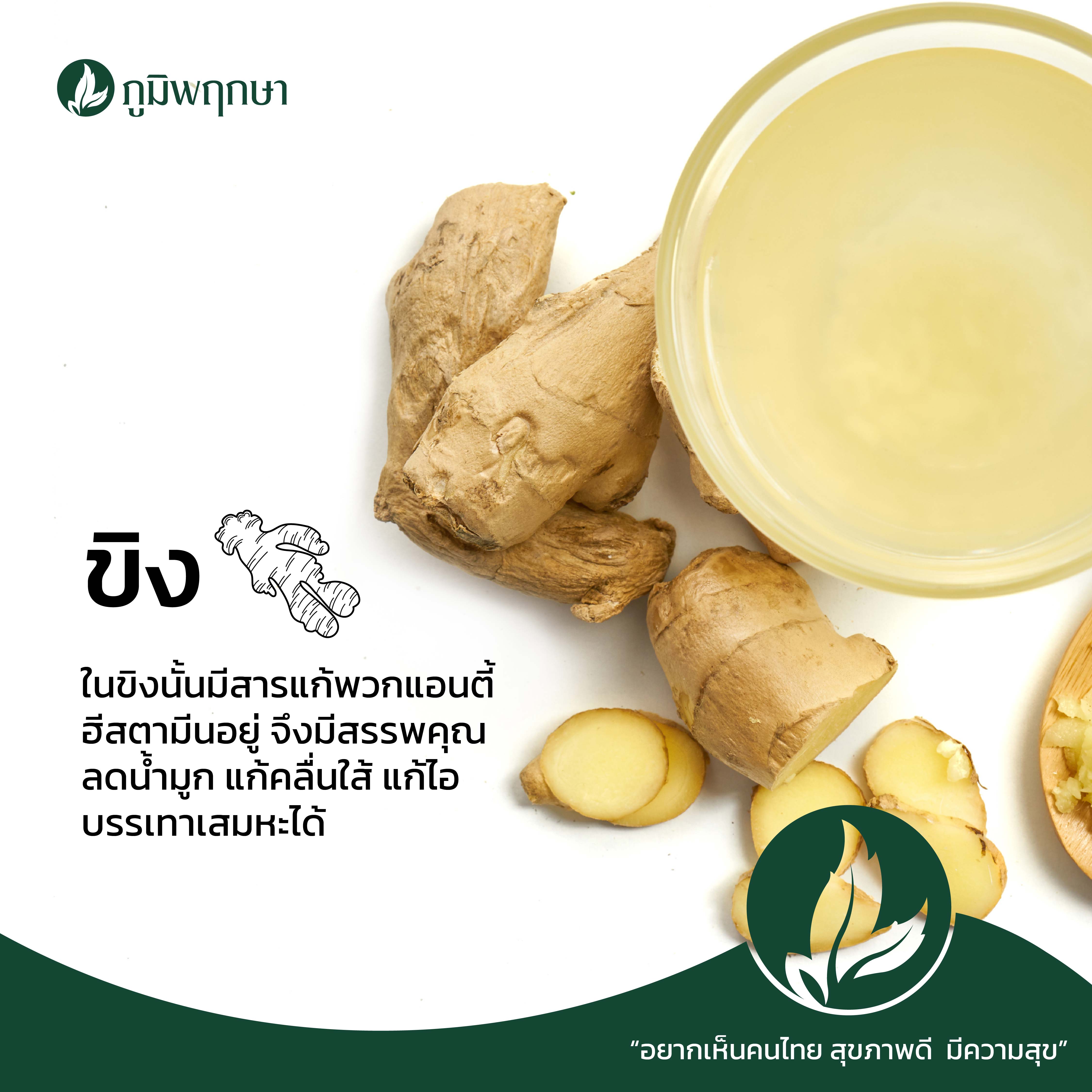"ขิง" ขิงมีสารแก้พวกแอนตี้ฮีสตามีนอยู่ จึงมีสรรพคุณ ลดน้ำมูก แก้คลื่นใส้ แก้ไอ บรรเทาเสมหะได้ นอกจากนี้ ยังช่วยแก้ไข้ และยังช่วยบรรเทาอาการต่างๆ ไม่ว่าจะเป็นไข้หวัดและอาการปวดเมี่อยก็นำขิงมารักษาได้ โดยนำขิงแก่มาหั่นเป็นแว่น แล้วนำไปคั้นเอาน้ำ หรือต้มแล้วดื่มร้อน ๆ ช่วยลดน้ำมูก แก้ไอขับเสมหะ คอโล่ง จมูกโล่ง