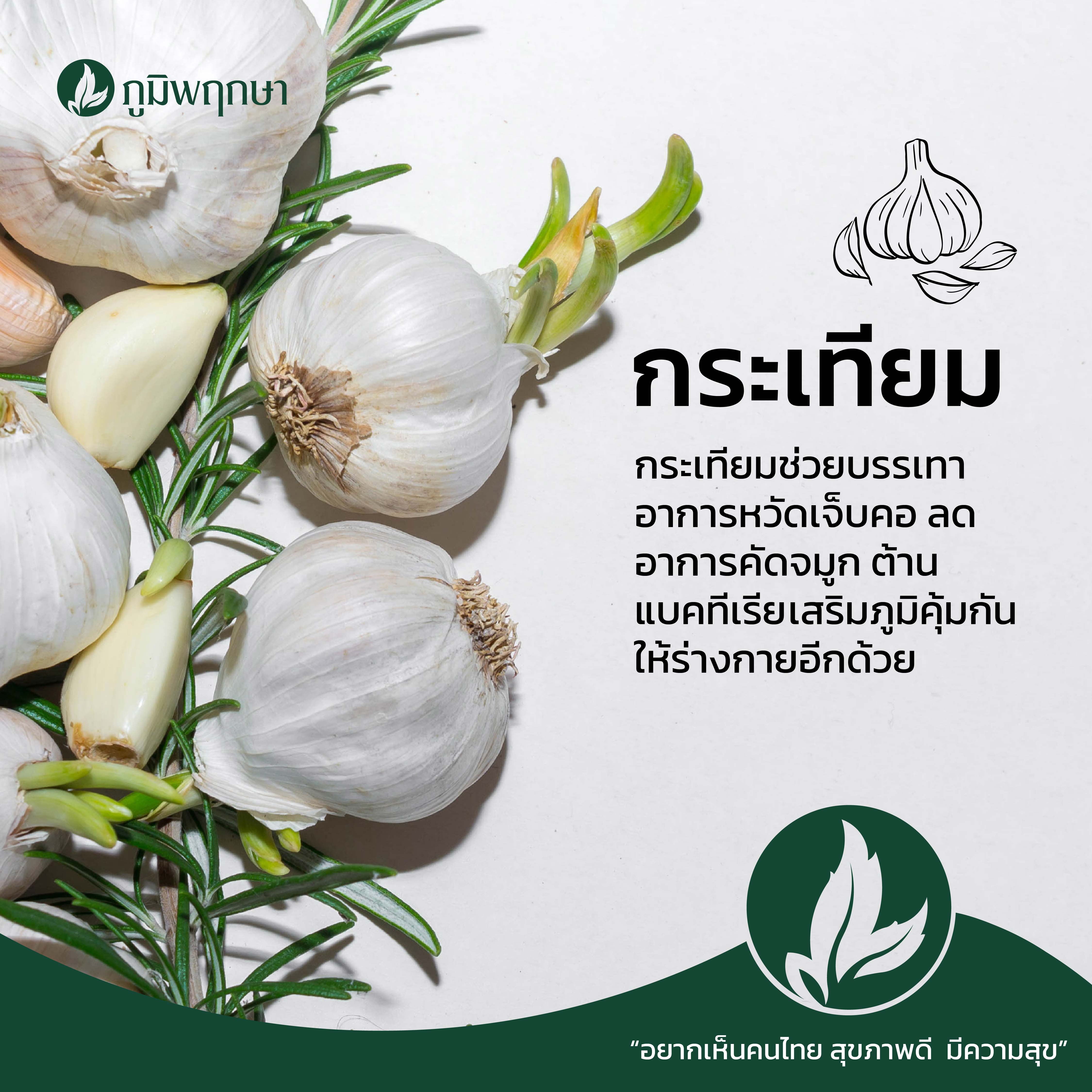 "กระเทียม" คู่ครัวคนไทย นอกจากนำไปปรุงเป็นอาหารหลากหลายจาน เพิ่มความอร่อยให้จานโปรดของคุณแล้ว กระเทียมก็ยังช่วยบรรเทาอาการหวัดเจ็บคอ ลดอาการคัดจมูก ต้านแบคทีเรีย เสริมภูมิคุ้มกันให้ร่างกายอีกด้วย โดยให้นำกลีบกระเทียมประมาณ 2 – 3 กลีบ ลงในแก้วและผสมน้ำร้อนลงไป เติมผงขมิ้นอีกครึ่งช้อนชา ใช้ดื่มทุกวันหรือนำมาใส่กับซุปเพื่อดื่มหรือจิบก็ได้เช่นกัน หรือจะ รับประทานกระเทียมเปล่า ๆ หรือกินกับข้าวด้วยจะช่วยลดอาการหวัดให้กินพร้อมกับข้าววันละมื้อ