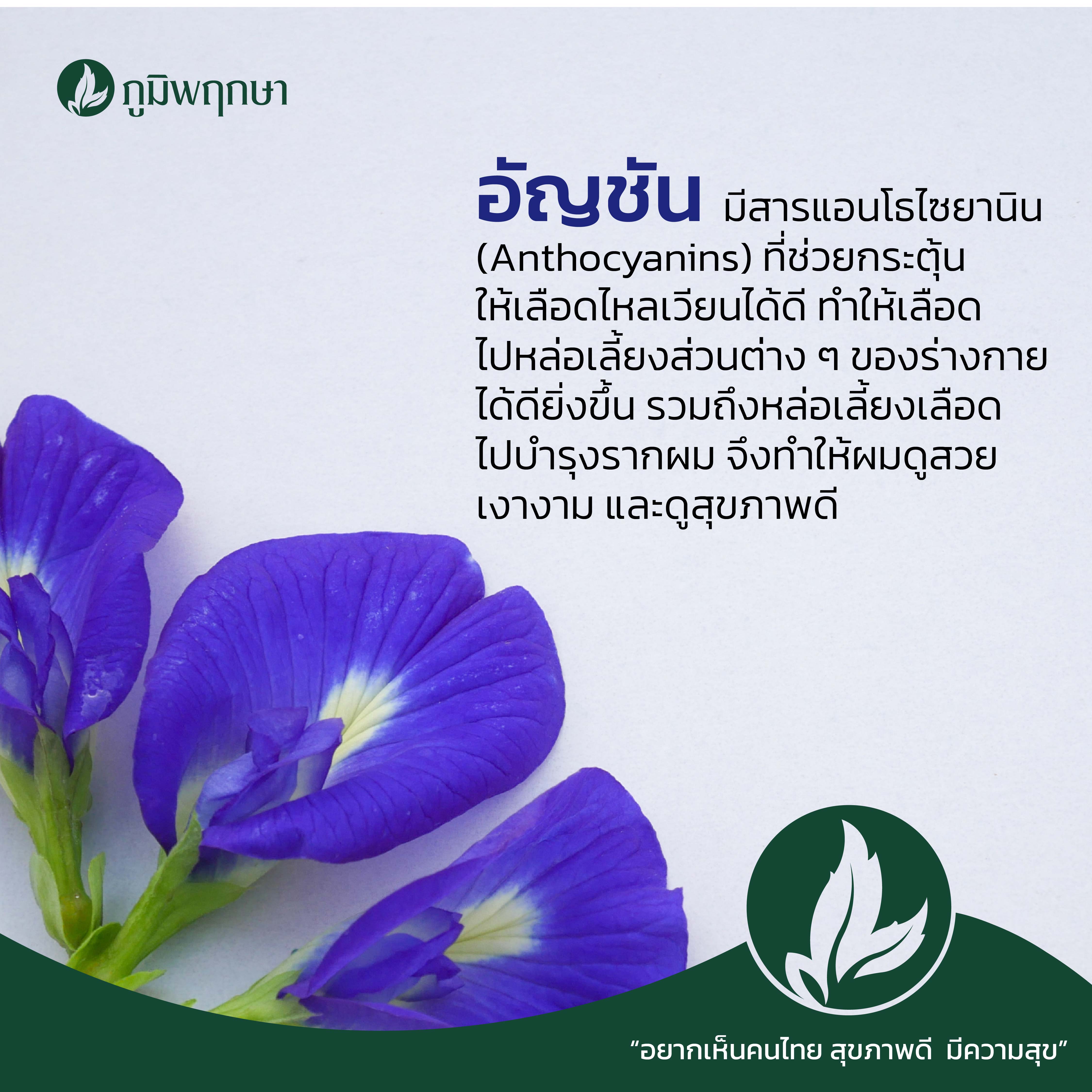 อัญชันทำให้ผมดกดำได้จริง แต่เป็นส่วนหนึ่งในประโยชน์หลากหลายของสารแอนโธไซยานิน (Anthocyanins) ที่มีในดอกอัญชัน ยังช่วยให้หลอดเลือดแข็งแรงและกระตุ้นให้เลือดไหลเวียนได้ดี ทำให้เลือดไปหล่อเลี้ยงส่วนต่าง ๆ ของร่างกายได้ดียิ่งขึ้น เช่น ไปหล่อเลี้ยงเลือดไปบำรุงรากผม จึงทำให้ผมดูสวย เงางาม และดูสุขภาพดี
