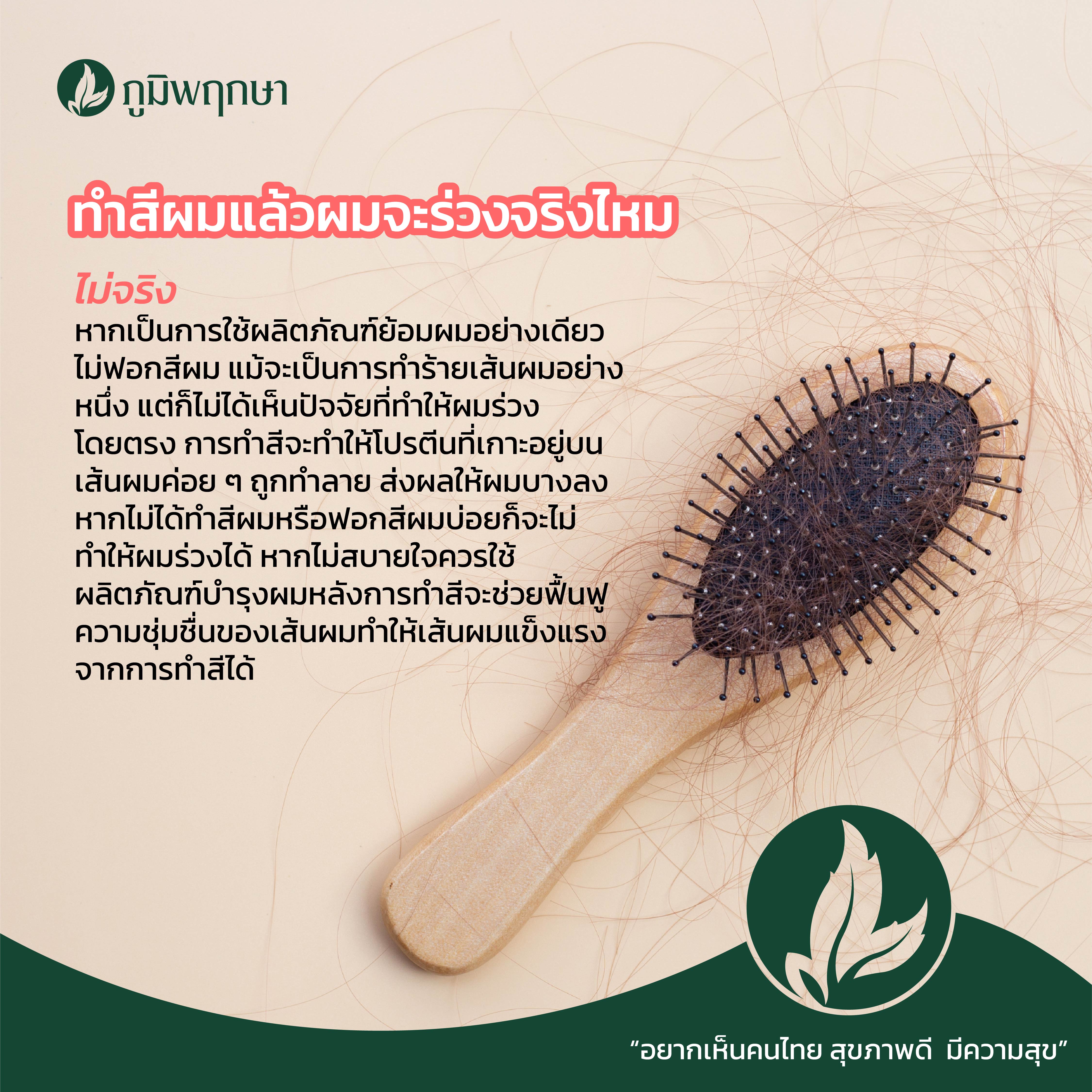 1. ทำสีผมแล้วผมจะร่วงจริงไหม - ไม่จริง หากเป็นการใช้ผลิตภัณฑ์ย้อมผมอย่างเดียวไม่ฟอกสีผม แม้จะเป็นการทำร้ายเส้นผมอย่างหนึ่ง แต่ก็ไม่ได้เห็นปัจจัยที่ทำให้ผมร่วงโดยตรง การทำสีจะทำให้โปรตีนที่เกาะอยู่บนเส้นผมค่อย ๆ ถูกทำลาย ส่งผลให้ผมบางลง หากไม่ได้ทำสีผมหรือฟอกสีผมบ่อยก็จะไม่ทำให้ผมร่วงได้ หากไม่สบายใจควรใช้ผลิตภัณฑ์บำรุงผมหลังการทำสีจะช่วยฟื้นฟูความชุ่มชื่นของเส้นผมทำให้เส้นผมแข็งแรงจากการทำสีได้