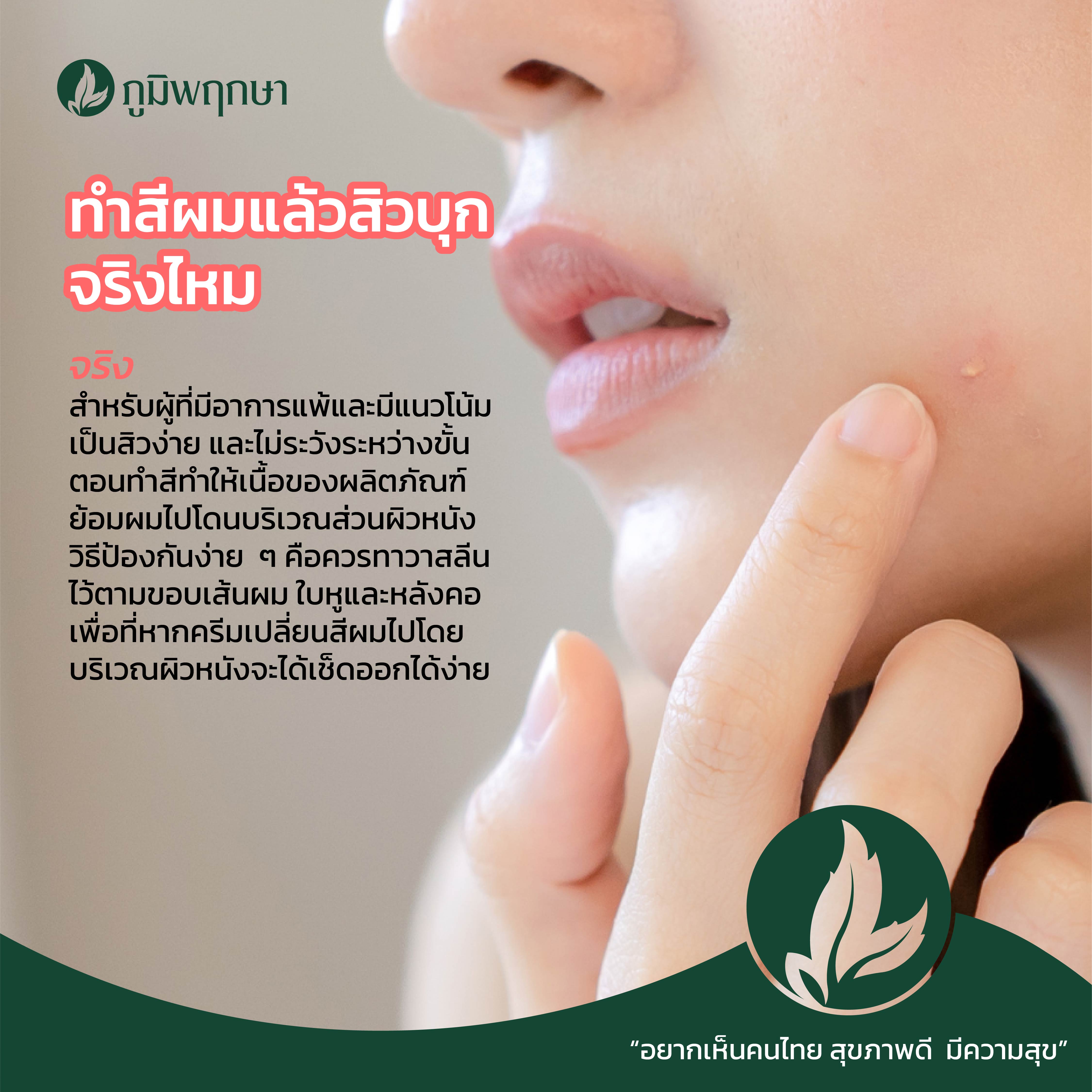 2. ทำสีแล้วสิวบุกจริงไหม - จริง สำหรับผู้ที่มีอาการแพ้และมีแนวโน้มเป็นสิวง่าย และไม่ระวังระหว่างขั้นตอนทำสีทำให้เนื้อของผลิตภัณฑ์ย้อมผมไปโดนบริเวณส่วนผิวหนัง วิธีป้องกันง่าย ๆ คือควรทาวาสลีนไว้ตามขอบเส้นผม ใบหูและหลังคอเพื่อที่หากครีมเปลี่ยนสีผมไปโดยบริเวณผิวหนังจะได้เช็ดออกได้ง่าย