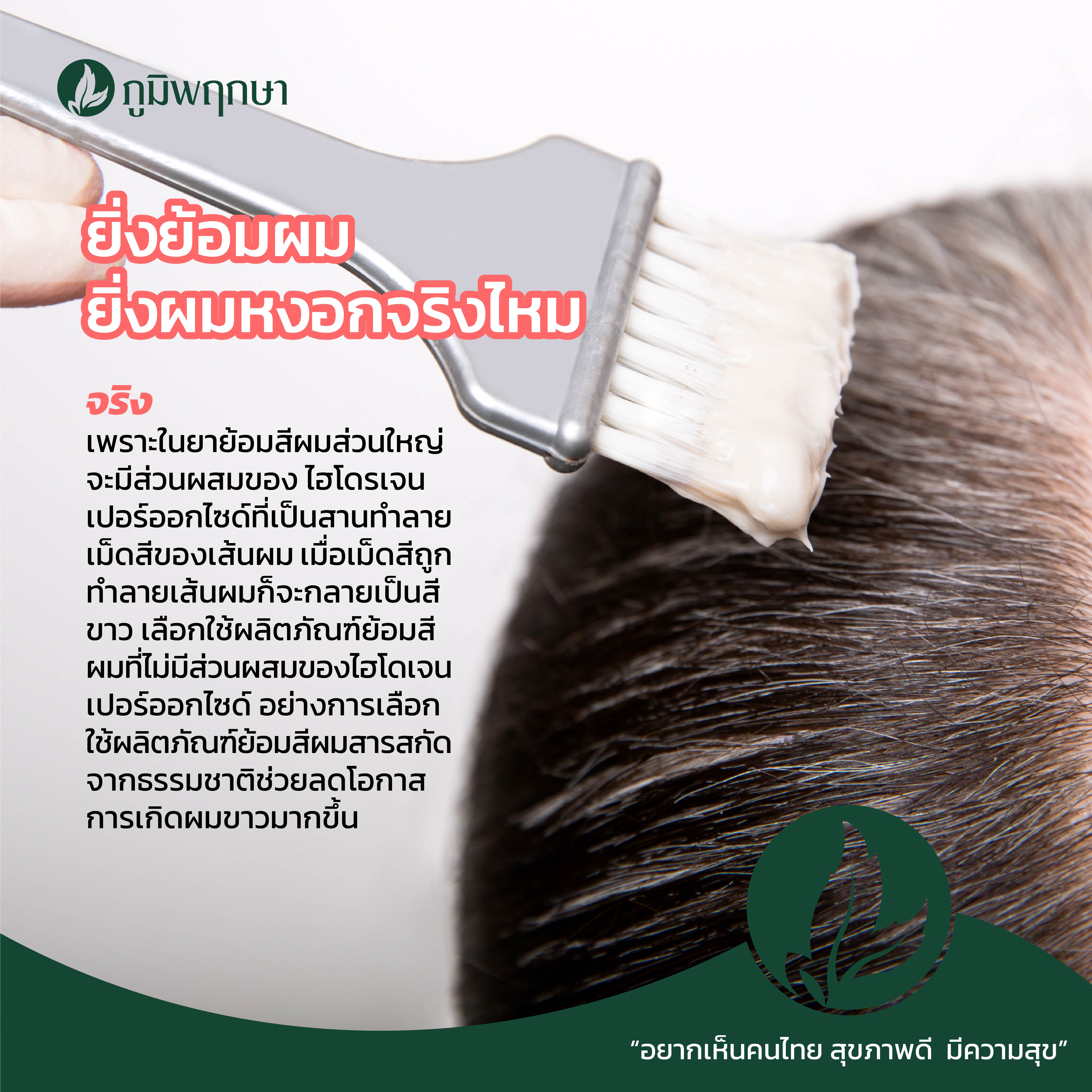 4 ยิ่งย้อมผม ยิ่งผมหงอกจริงไหม - จริง เพราะในยาย้อมสีผมส่วนใหญ่จะมีส่วนผสมของ ไฮโดรเจนเปอร์ออกไซด์ที่เป็นสานทำลายเม็ดสีของเส้นผม เมื่อเม็ดสีถูกทำลายเส้นผมก็จะกลายเป็นสีขาว เลือกใช้ผลิตภัณฑ์ย้อมสีผมที่ไม่มีส่วนผสมของไฮโดเจนเปอร์ออกไซด์ อย่างการเลือกใช้ผลิตภัณฑ์ย้อมสีผมสารสกัดจากธรรมชาติช่วยลดโอกาสการเกิดผมขาวมากขึ้น