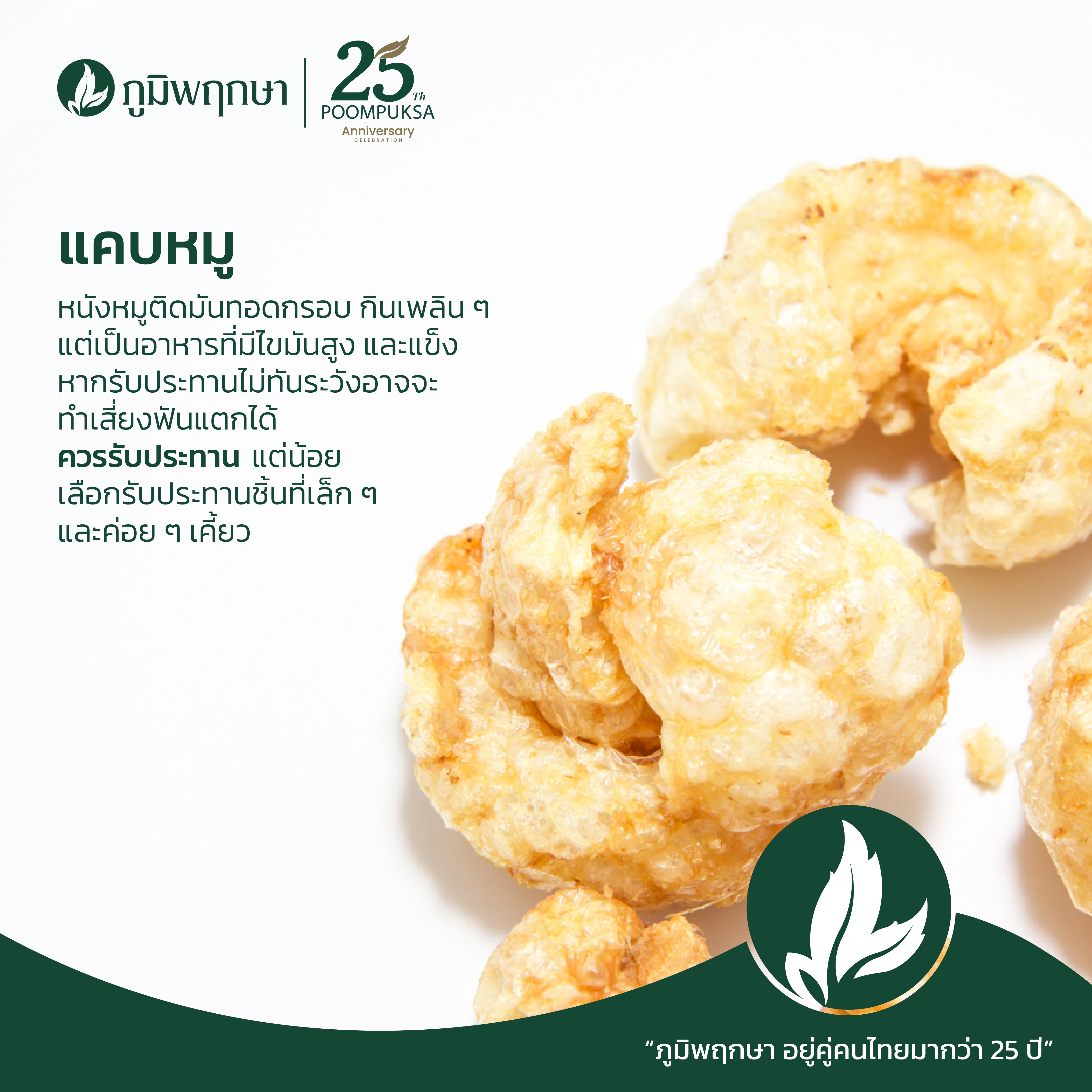แคบหมู : หนังหมูติดมันทอดกรอบ กินเพลิน ๆ แต่เป็นอาหารที่มีไขมันสูง และแข็ง หากรับประทานไม่ทันระวังอาจจะทำเสี่ยงฟันแตกได้ ควรรับประทานแต่น้อย เลือกรับประทานชิ้นที่เล็ก ๆ และค่อย ๆ เคี้ยว