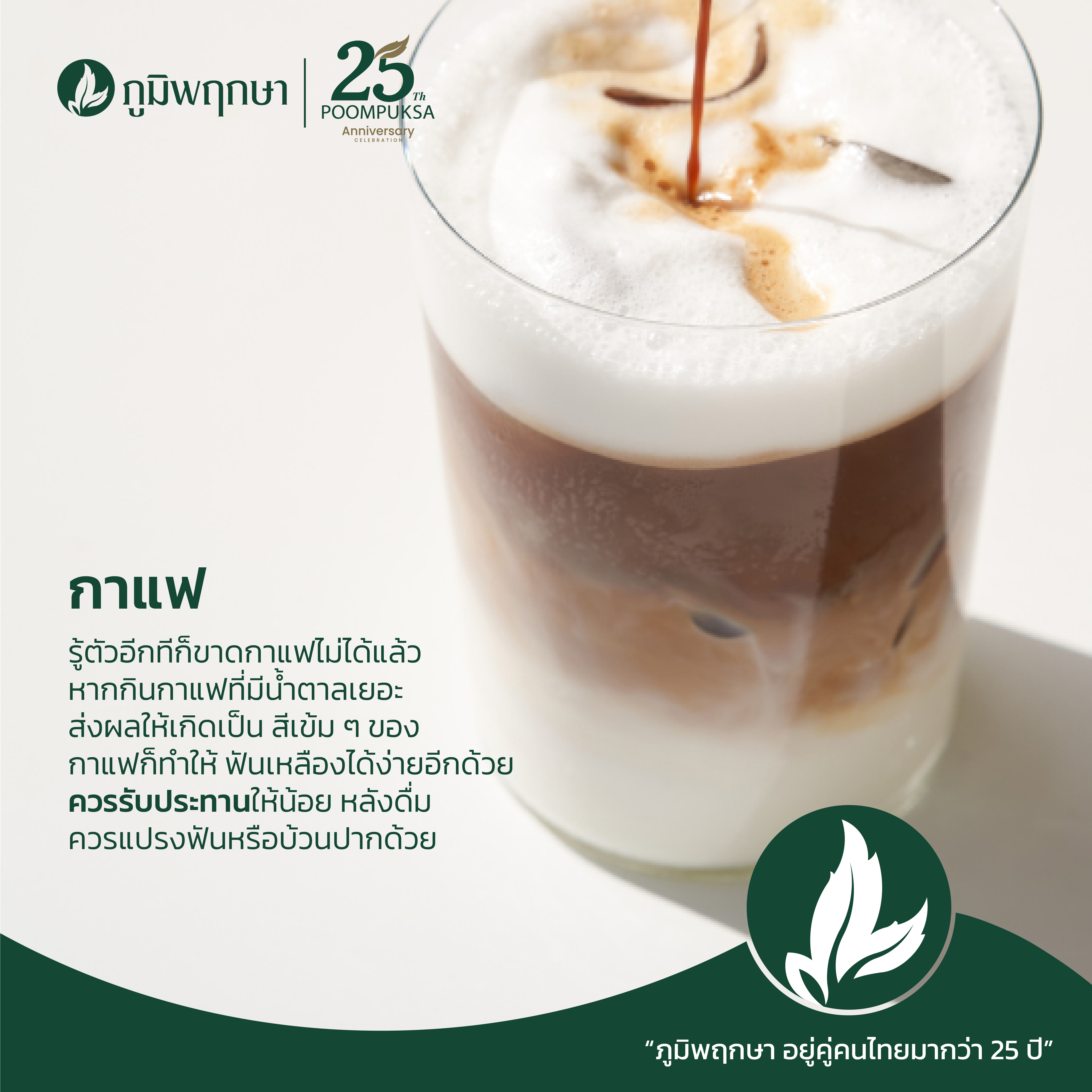 กาแฟ : รู้อีกทีก็ขาดกาแฟไม่ได้แล้ว หากกินกาแฟที่มีน้ำตาลเยอะ ส่งผลให้เกิดเป็น สีเข้ม ๆ ของกาแฟก็ทำให้ฟันเหลืองได้ง่ายอีกด้วย วิธีแก้คือควรบริโภคแต่น้อย หลังดื่มควรแปรงฟันหรือบ้วนปาก