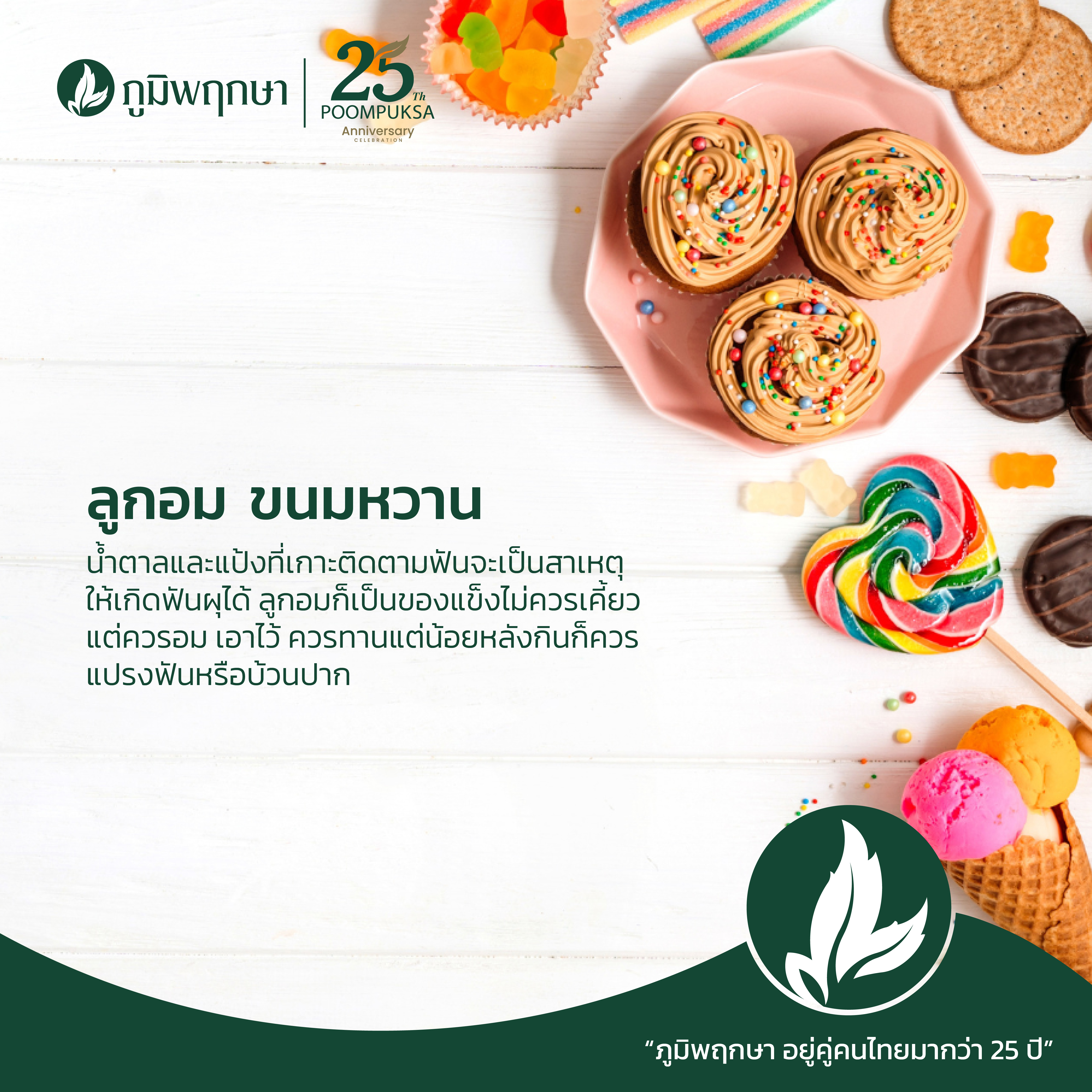 ลูกอม ขนม : น้ำตาลและแป้งที่เกาะติดตามฟันจะเป็นสาเหตุให้เกิดฟันผุได้ ลูกอมก็เป็นของแข็งไม่ควรเคี้ยวแต่ควรอม เอาไว้ ควรทานแต่น้อยหลังกินก็ควรแปรงฟันหรือบ้วนปาก