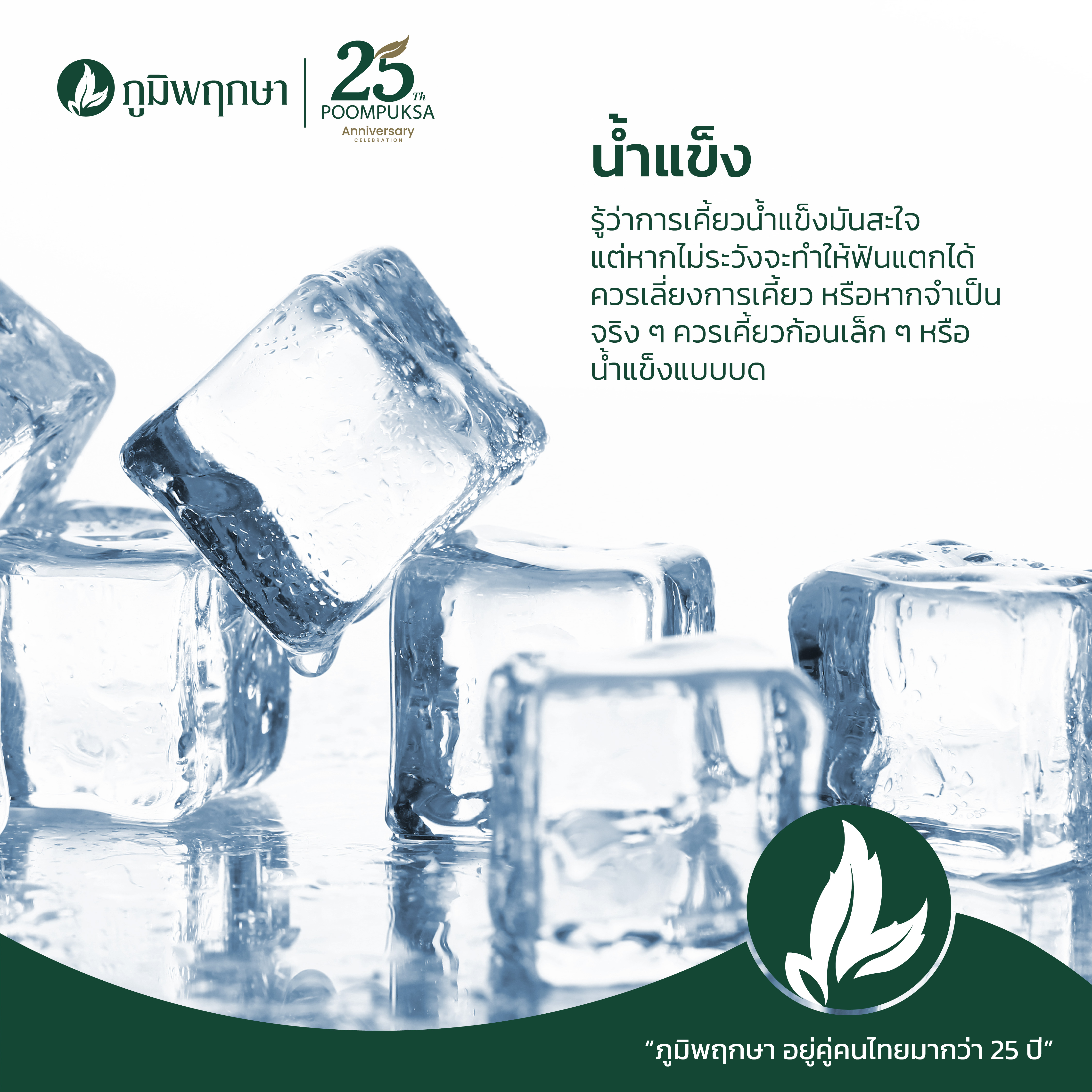 น้ำแข็ง : รู้ว่าการเคี้ยวน้ำแข็งมันสะใจ แต่หากไม่ระวังจะทำให้ฟันแตกได้ ควรเลี่ยงการเคี้ยว หรือหากจำเป็นจริง ๆ ควรเคี้ยวก้อนเล็ก ๆ หรือน้ำแข็งแบบบด