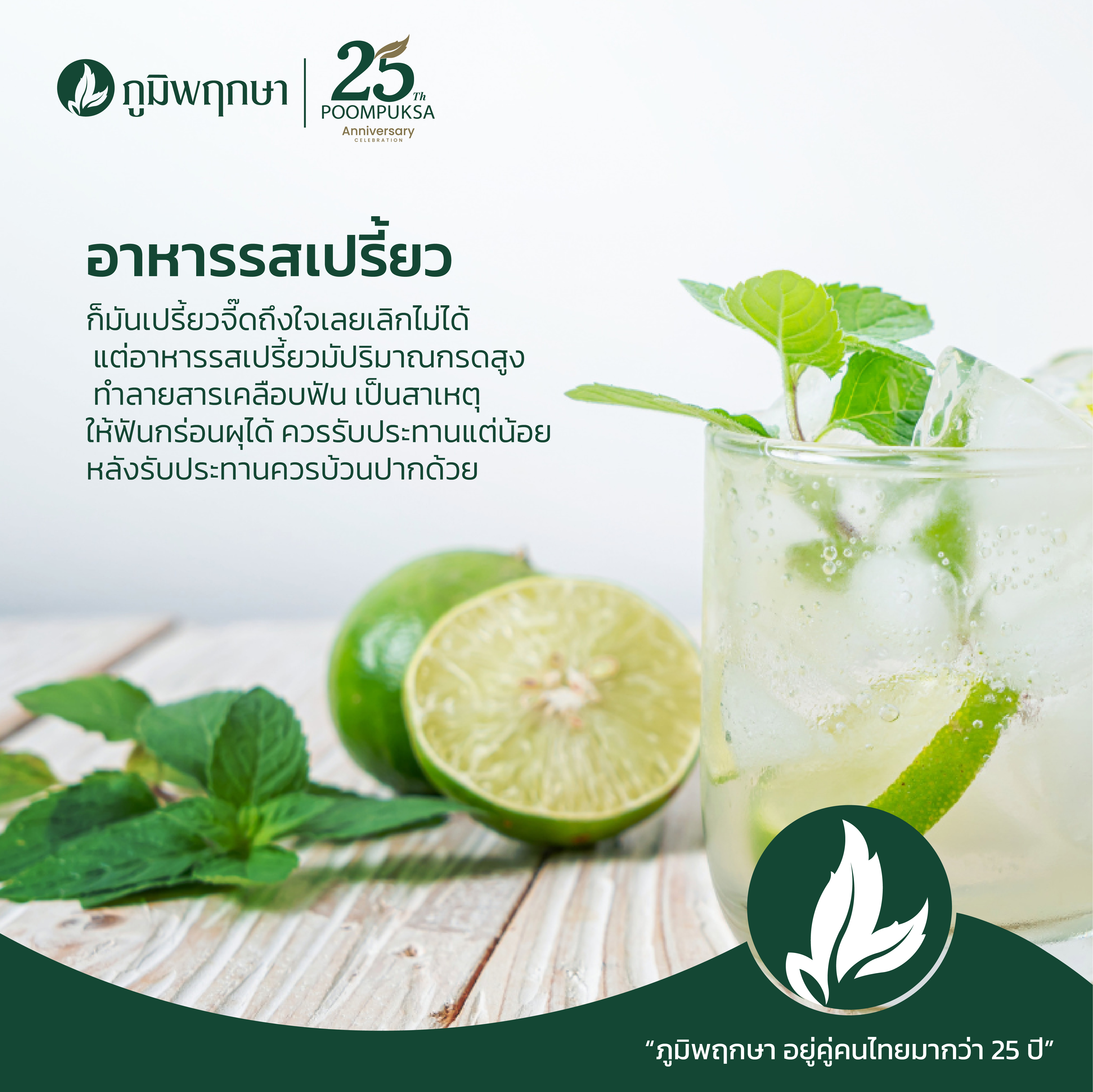 อาหารรสเปรี้ยว : ก็มันเปรี้ยวจี๊ดถึงใจเลยเลิกไม่ได้ แต่อาหารรสเปรี้ยวมัปริมาณกรดสูง ทำลายสารเคลือบฟัน เป็นสาเหตุให้ฟันกร่อนผุได้ ควรรับประทานแต่น้อย หลังรับประทานควรบ้วนปากด้วย