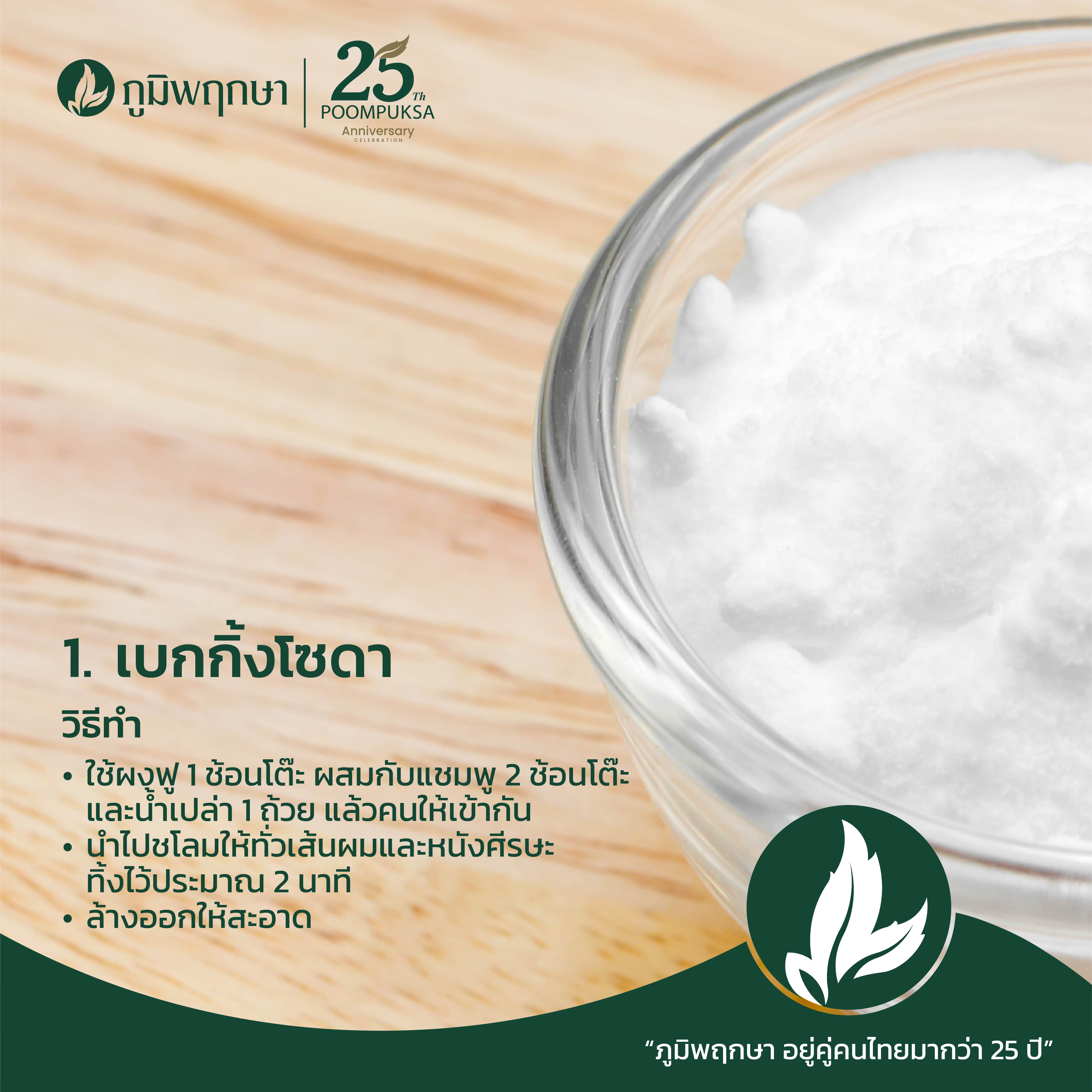 • ใช้ผงฟู 1 ช้อนโต๊ะ ผสมกับ แชมพู 2 ช้อนโต๊ะ และน้ำเปล่า 1 ถ้วย แล้วคนให้เข้ากัน