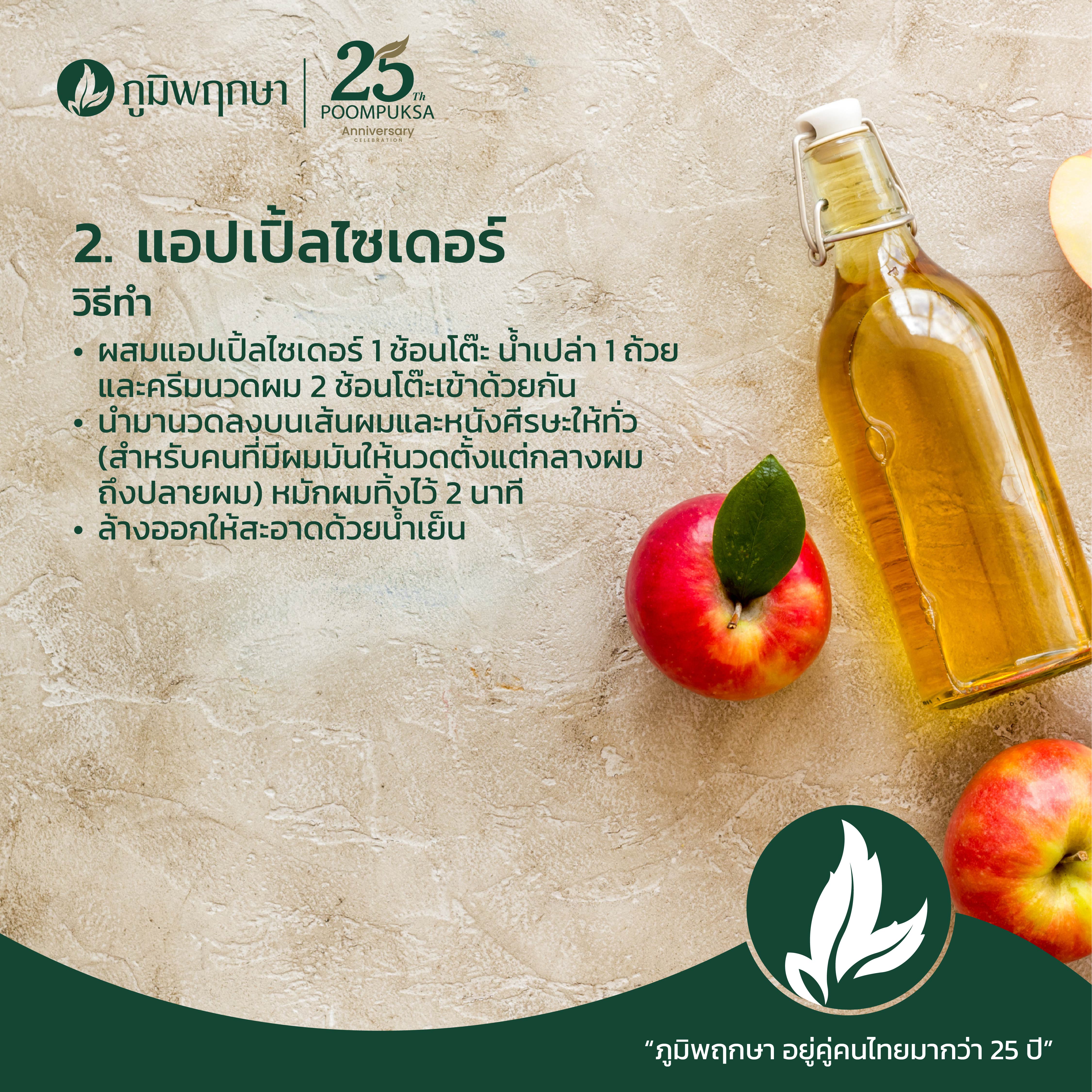 • ผสมแอปเปิ้ลไซเดอร์ 1 ช้อนโต๊ะ น้ำเปล่า 1 ถ้วย และครีมนวดผม 2 ช้อนโต๊ะเข้าด้วยกัน