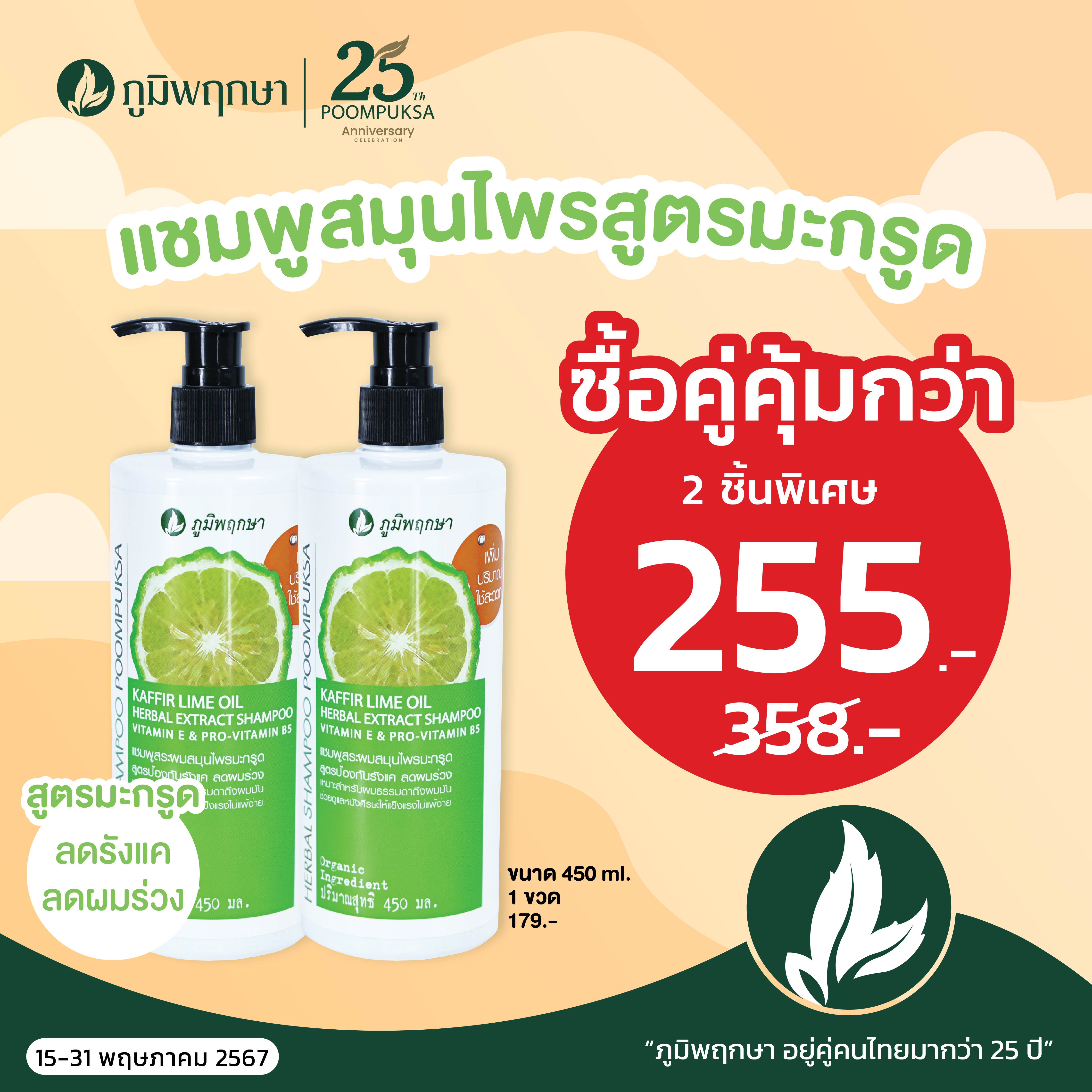 แชมพูสมุนไพรสูตรมะกรูด ขนาด 450 มล. ซื้อ 2 ชิ้นพิเศษ 255.- (ปกติ 358.-)