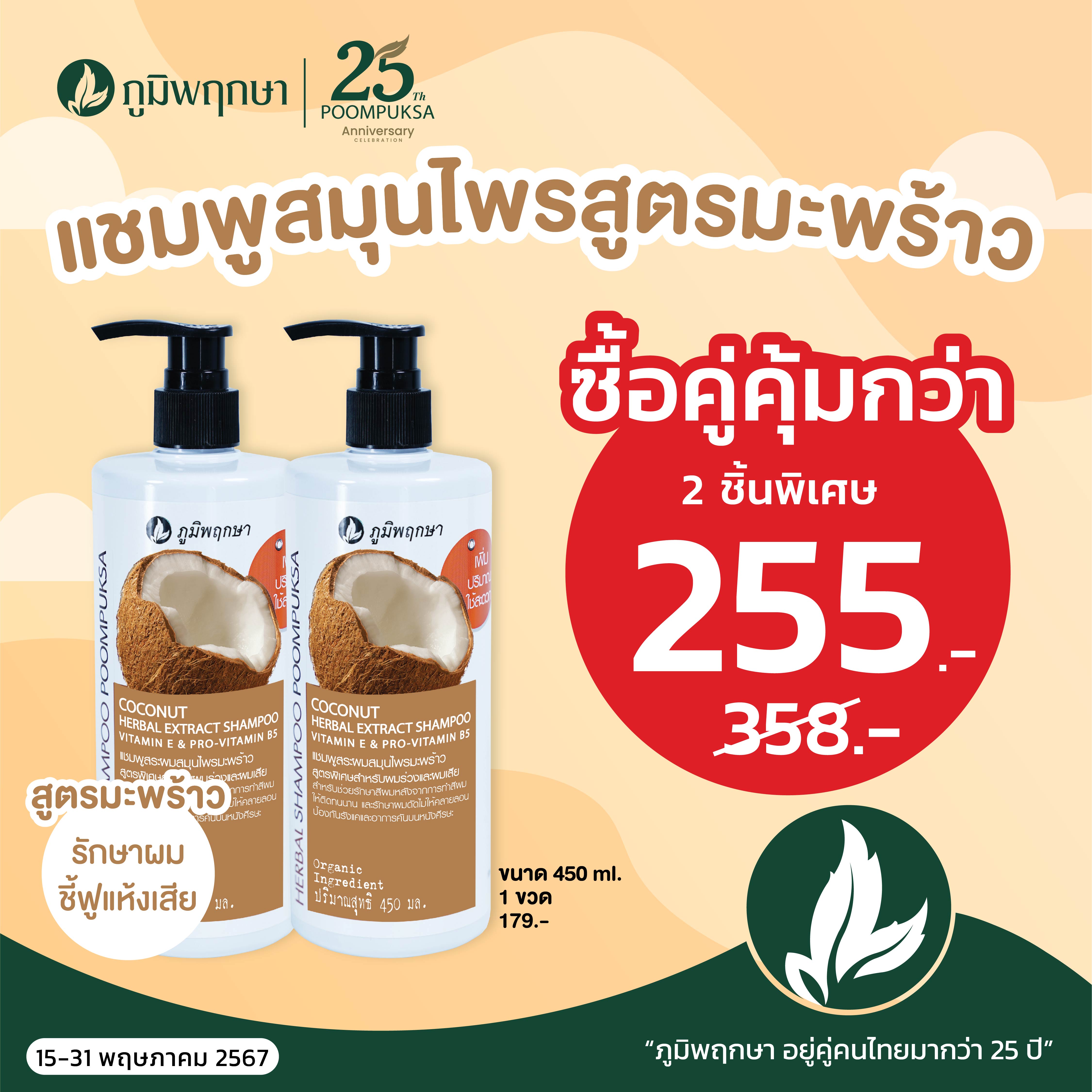 แชมพูสมุนไพรสูตรมะพร้าว ขนาด 450 มล. ซื้อ 2 ชิ้นพิเศษ 255.- (ปกติ 358.-)