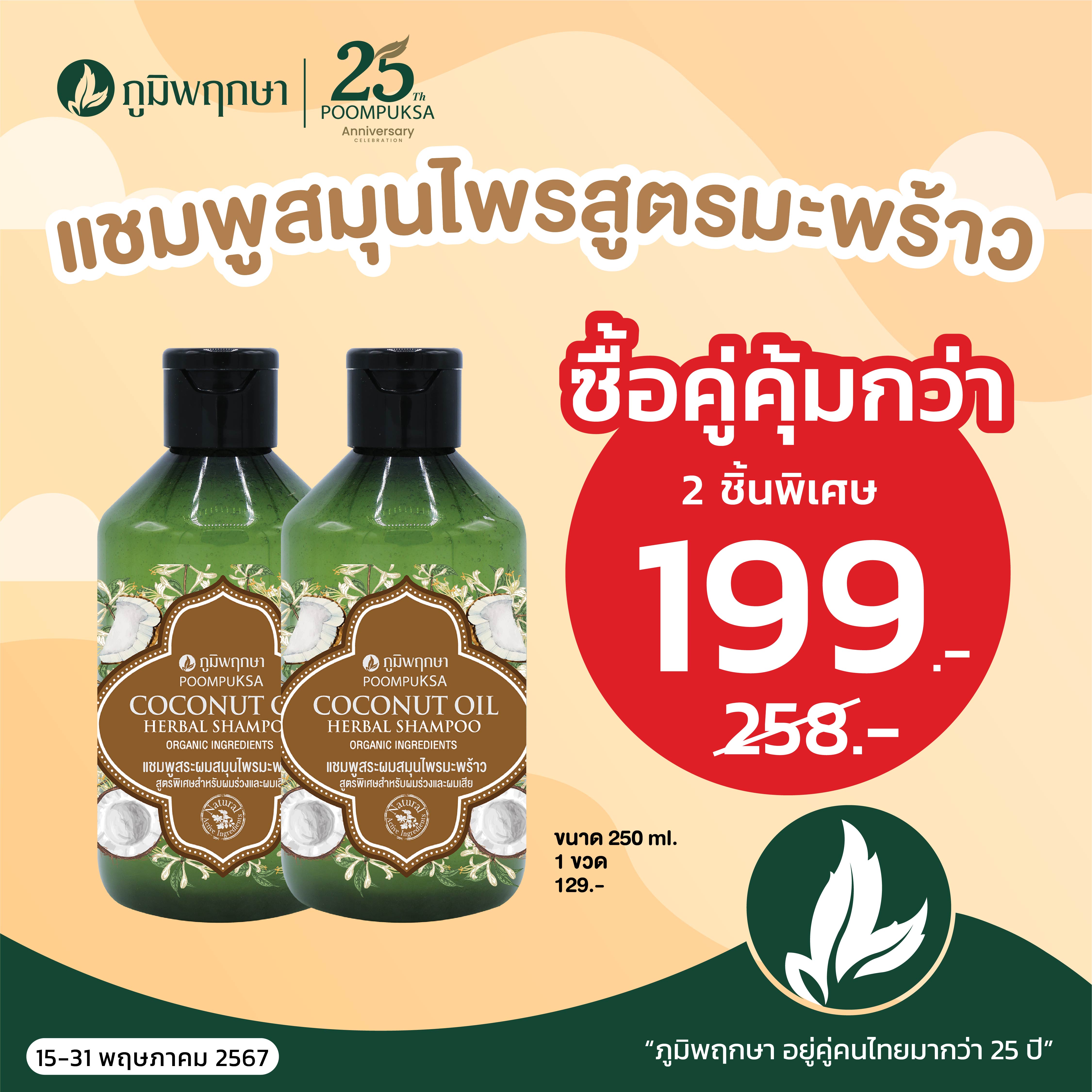 แชมพูสมุนไพรสูตรมะพร้าว ขนาด 250 มล. ซื้อ 2 ชิ้นพิเศษ 199.- (ปกติ 258.-)