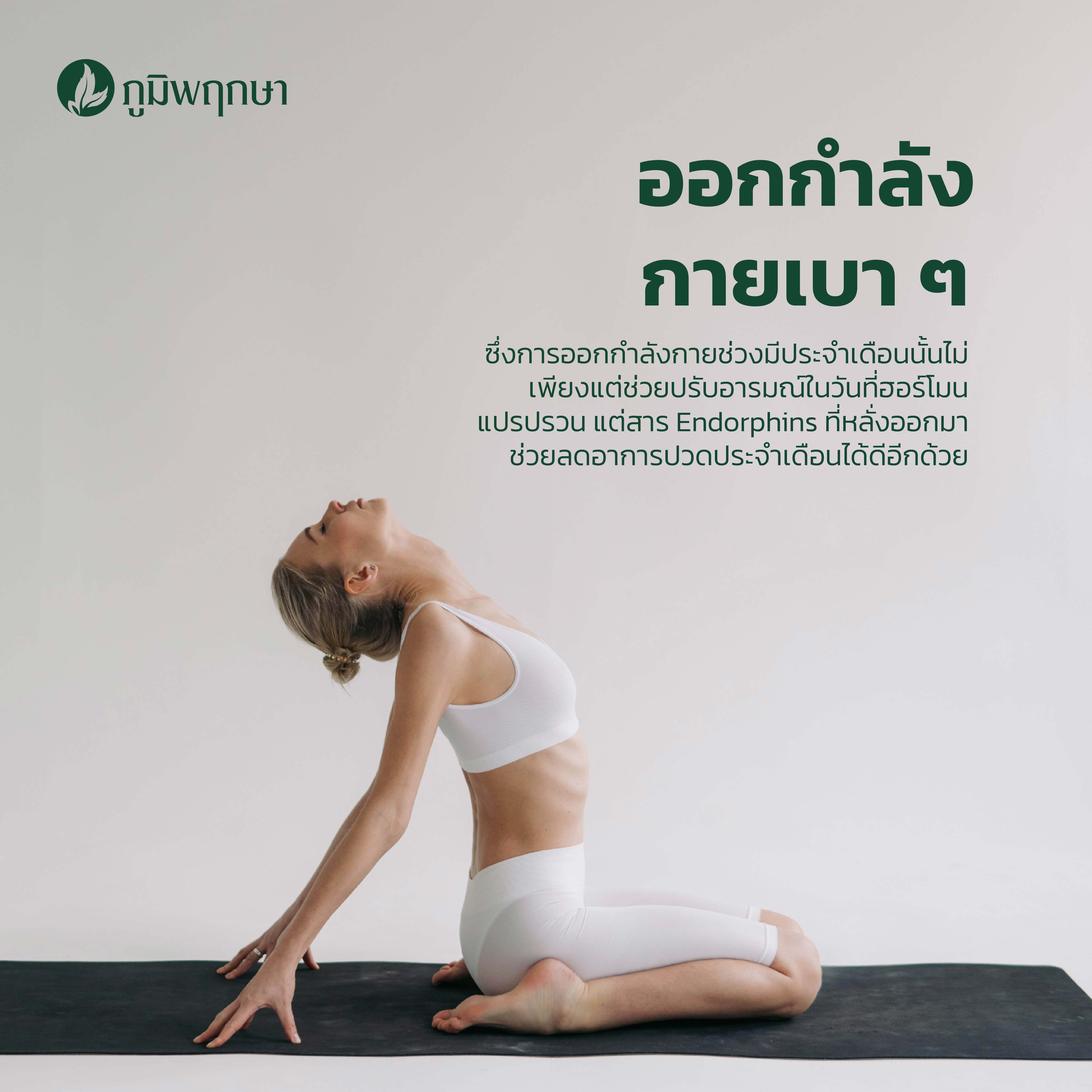 หลายคนเข้าใจว่าช่วงมีประจำเดือนไม่ควรออกกำลังกาย เพราะเป็นช่วงที่ร่างกายอ่อนเพลียและเสี่ยงต่อการเป็นลมได้ง่าย แต่จริง ๆ แล้วผู้หญิงทุกคนสามารถออกกำลังกายได้ขณะมีประจำเดือน เพียงแต่ต้องเลือกให้เหมาะสมกับความแข็งแรงของตัวเอง อาจจะเลือกเป็นกิจกรรมที่ไม่หนักมาก เช่น การเดินเร็ว หรือ เล่นโยคะในท่าง่าย ๆ ซึ่งการออกกำลังกายช่วงมีประจำเดือนนั้นไม่เพียงแต่ช่วยปรับอารมณ์ในวันที่ฮอร์โมนแปรปรวน แต่สาร Endorphins ที่หลั่งออกมา ช่วยลดอาการปวดประจำเดือนได้ดีอีกด้วย