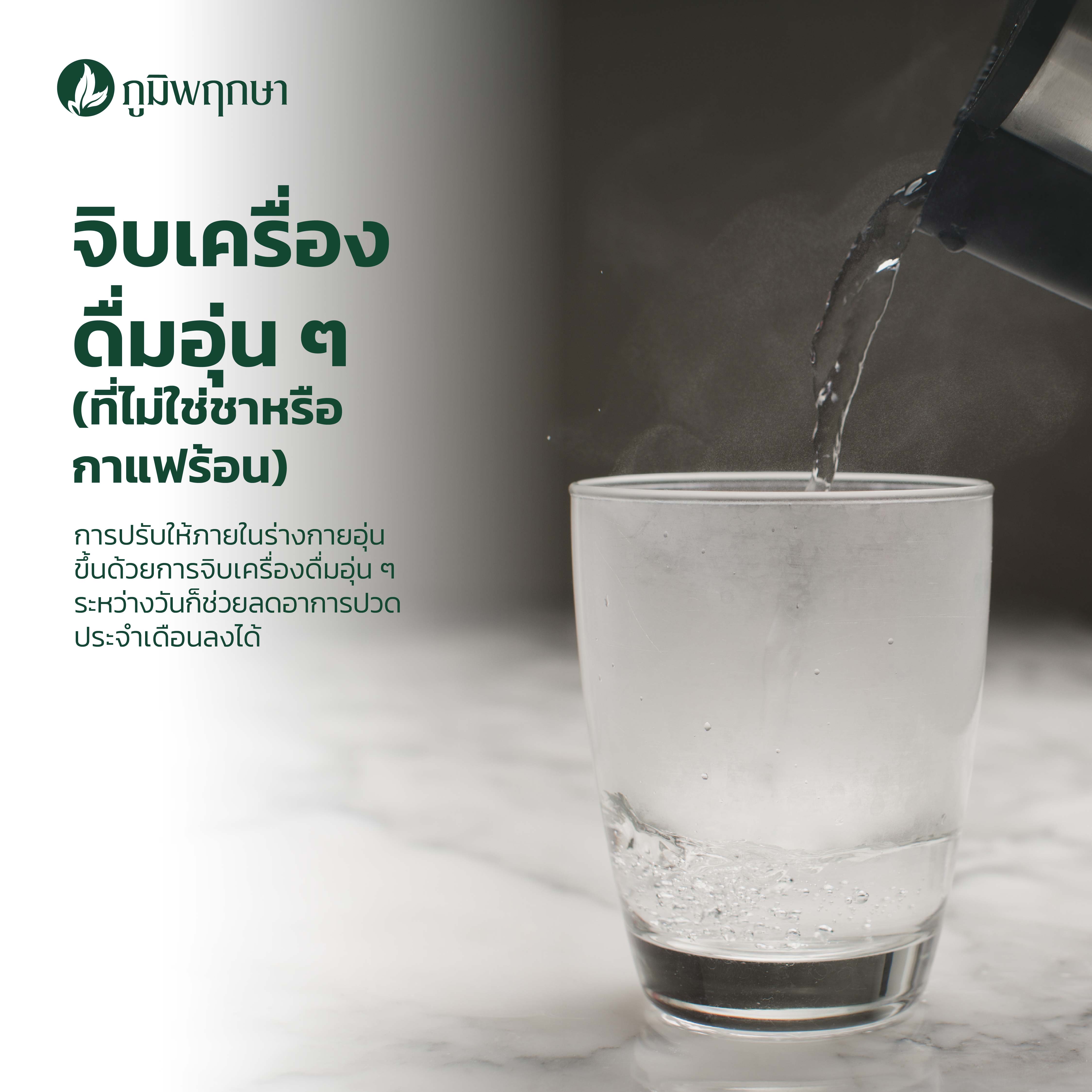 นอกจากการสัมผัสความร้อนจากภายนอก การปรับให้ภายในร่างกายอุ่นขึ้นด้วยการจิบเครื่องดื่มอุ่น ๆ ระหว่างวันก็ช่วยลดอาการปวดประจำเดือนลงได้ แต่ไม่ควรดื่มเป็นชาหรือกาแฟร้อน เพราะเครื่องดื่มประเภทคาเฟอีนจะมีฤทธิ์ขับปัสสาวะ ส่งผลให้อาการปวดประจำเดือนเพิ่มความรุนแรงขึ้นได้ ควรเลือกเป็นน้ำอุ่นธรรมดา น้ำผึ้งผสมมะนาว หรือน้ำขิงอุ่น ๆ จะดีกว่า